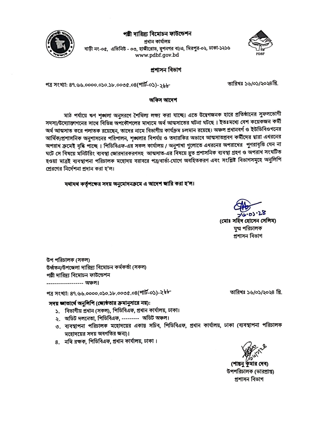 মাঠ পর্যায়ে ঋণ শৃঙ্খলা নিরসনের অফিস আদেশ