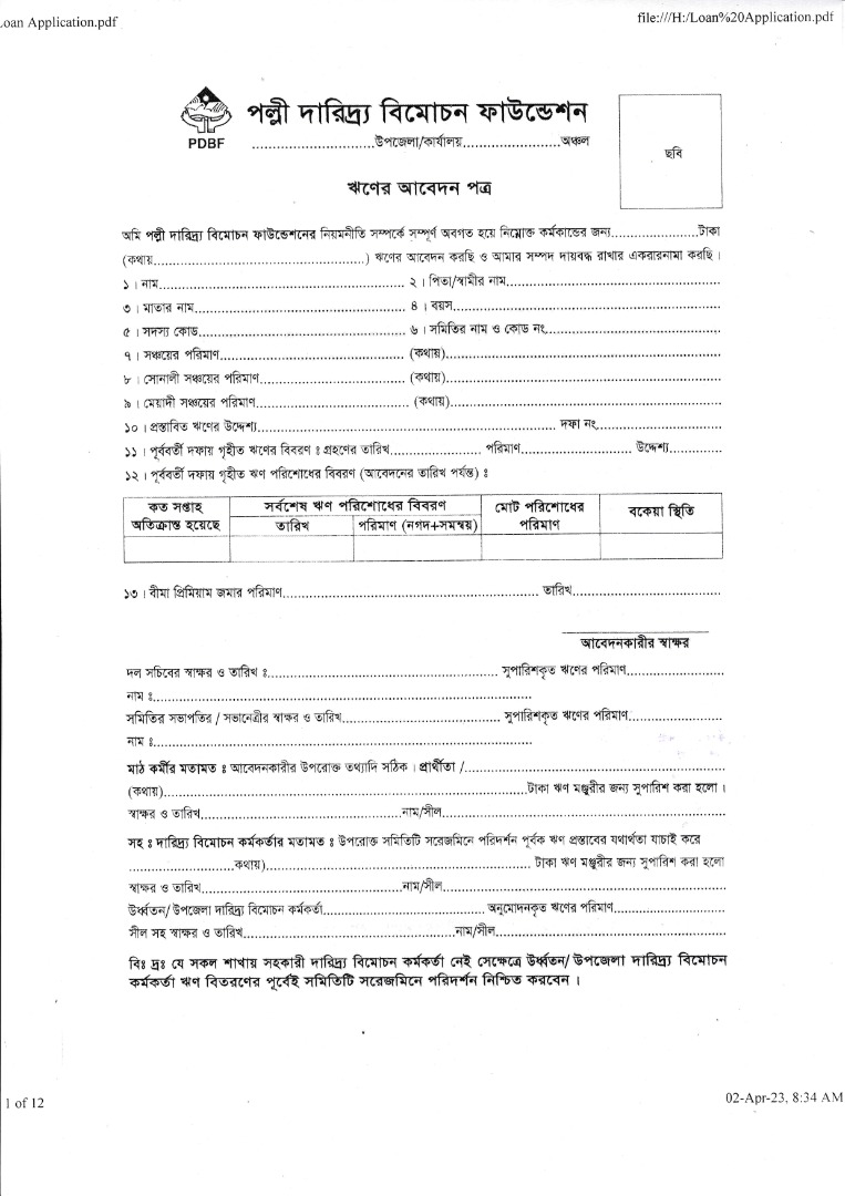 | ঋণের আবেদন ফি: ১০/- (দশ) টাকা প্রাপ্তিস্থানঃ উপজেলা কার্যালয়,পিডিবিএফ। | ০৩-০৫দিন